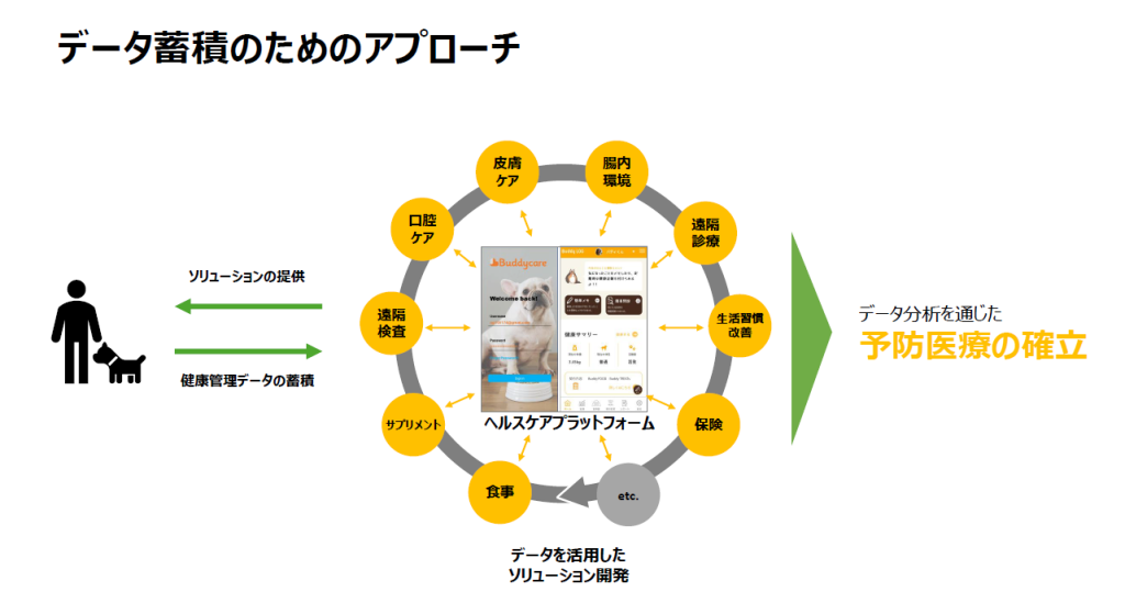 愛犬のデータを蓄積するために、単にご家族にデータ収集の協力を依頼するのではなかなか集まるものではない…そこで、健康管理のソリューションを提供し、使っていただくことでデータを蓄積していくというビジネスモデルに行きつきました。
