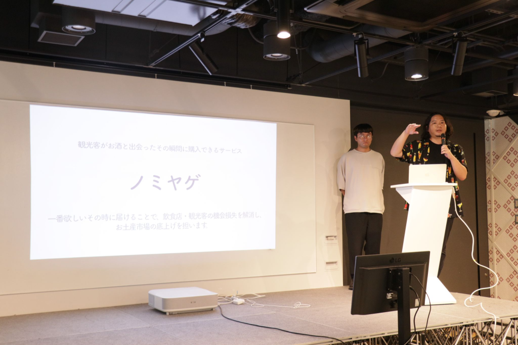 最優秀賞に選ばれたビジネスプランは、観光客がお酒と出会ったその瞬間にお酒を購入できるサービス「ノミヤゲ」。きっかけは、旅行会社として団体の添乗に行ったときのこと。飲食店でお客さんが気に入ったお酒のボトルを購入したいと思っても、飲食店は酒販免許を持っていないため購入できない現状があり、「観光の体験価値が下がっている」と感じた体験から、このサービスを考えたそうです。